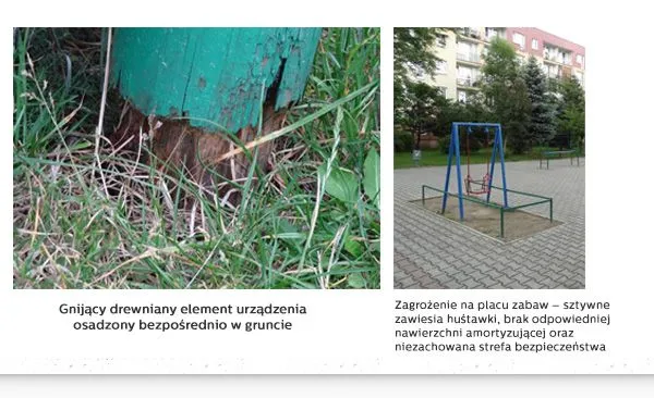 - Uszkodzone urządzenia, takie jak huśtawki czy karuzele, mogą być niebezpieczne w użyciu.